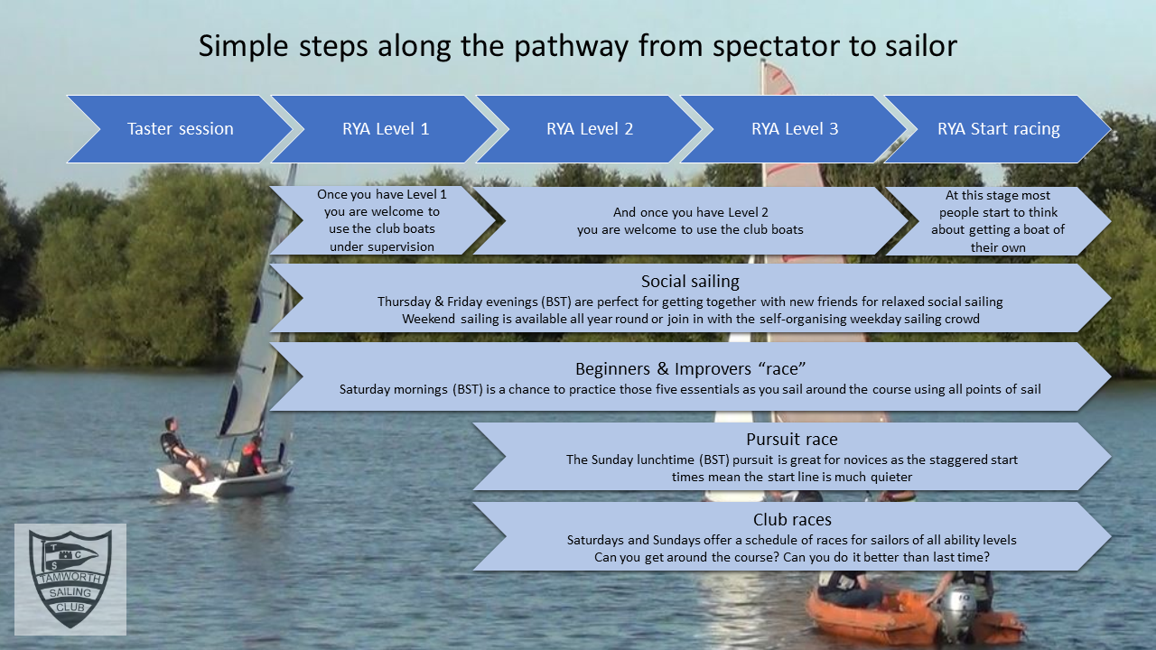 Learning to sail is a bit like learning to drive a car or ride a motorbike which starts with formal instruction under the close supervision of an instructor. Once you pass your test you are deemed safe to continue learning on your own and the more you practice the more experience you gain under different conditions. Our sailing pathway infographic helps to explain a typicial journey from spectator to sailor along with the support and opportunities available to members for you to practice what you have learnt.